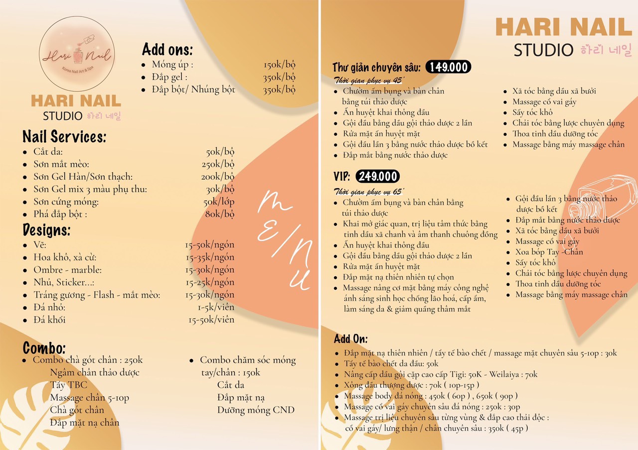 Đến với HARI NAIL STUDIO, bạn sẽ được thư giãn trong không gian sang trọng, lịch sự và thưởng thức các dịch vụ nail, spa đẳng cấp.